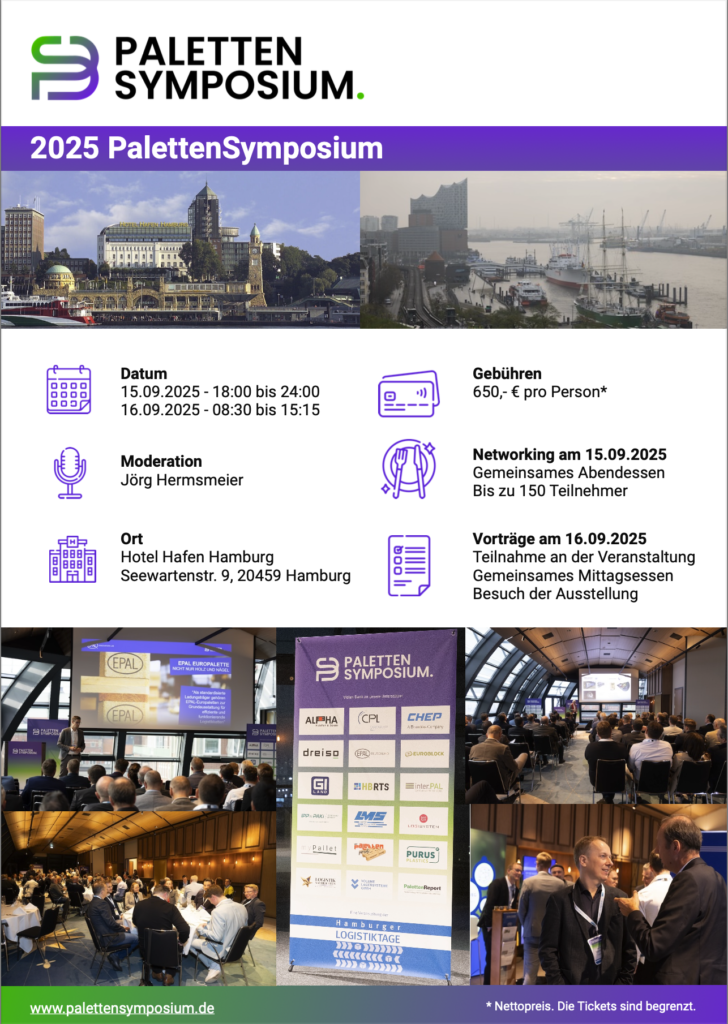 Ja, ich möchte an dem PalettenSymposium am 15.09-16.09.2025 teilnehmen und melde mich verbindlich zum Preis von 650,00 Euro zzgl. MwSt. zu folgenden Aktivitäten an: